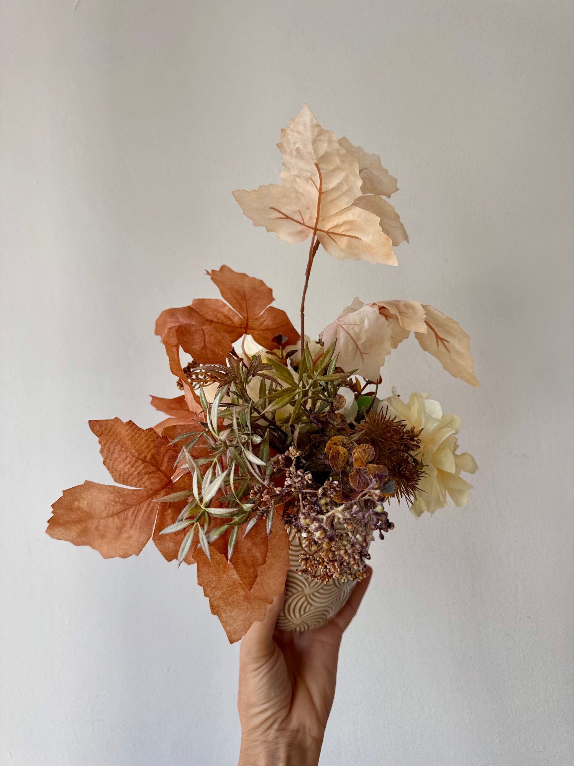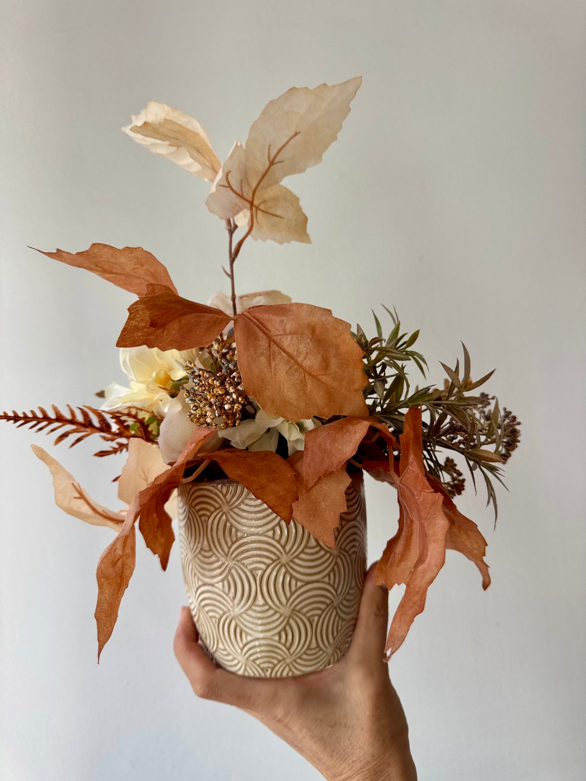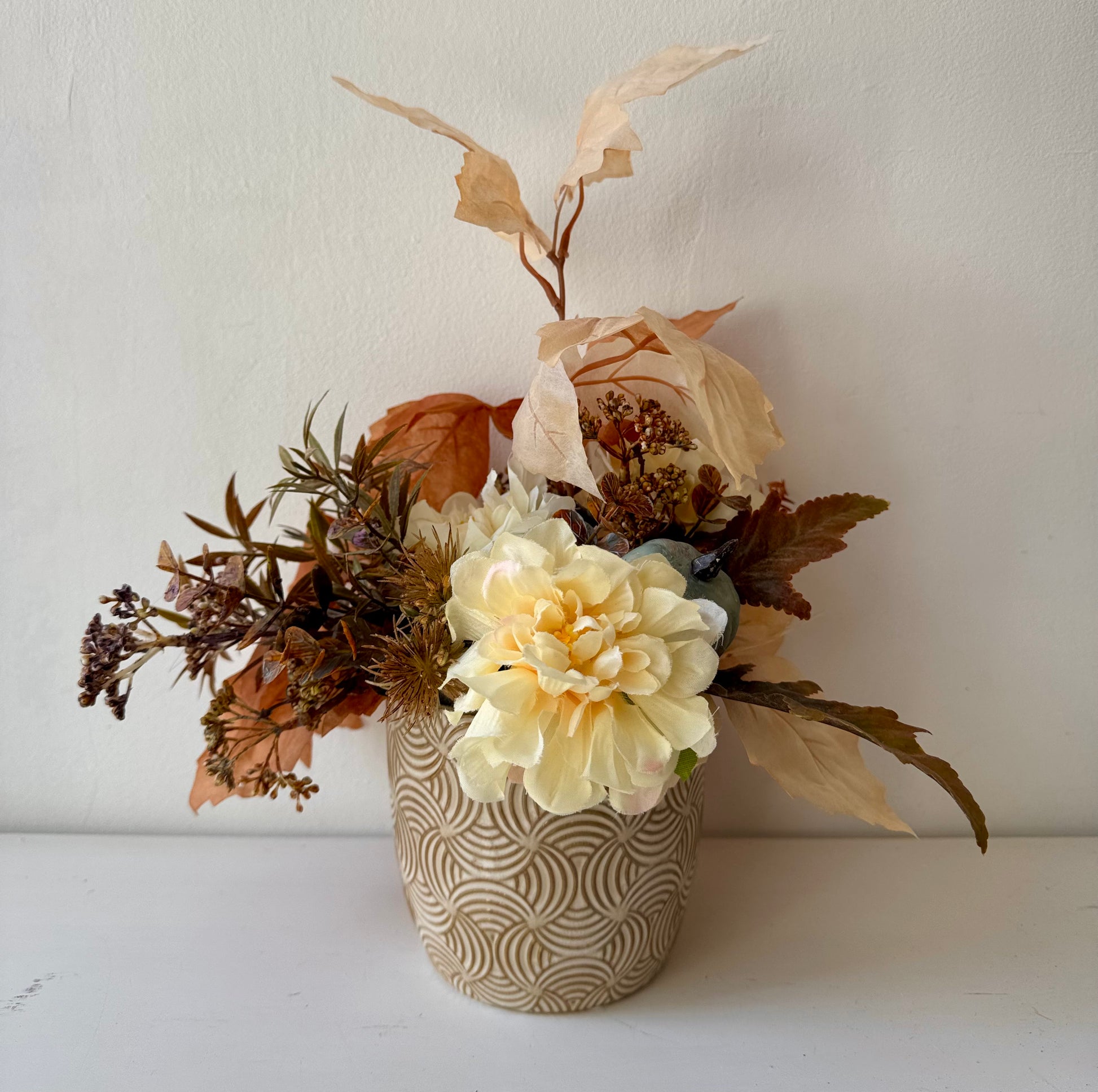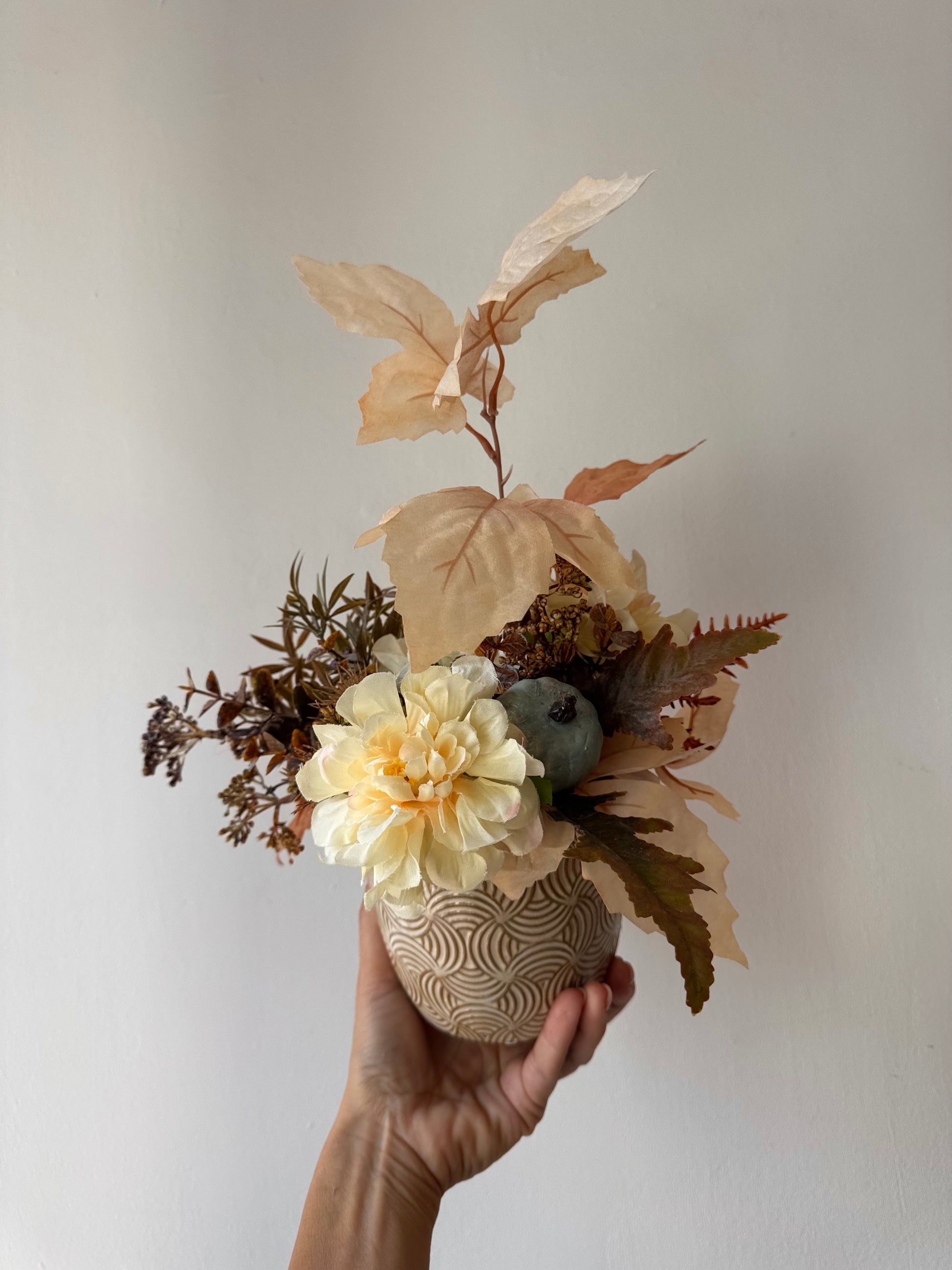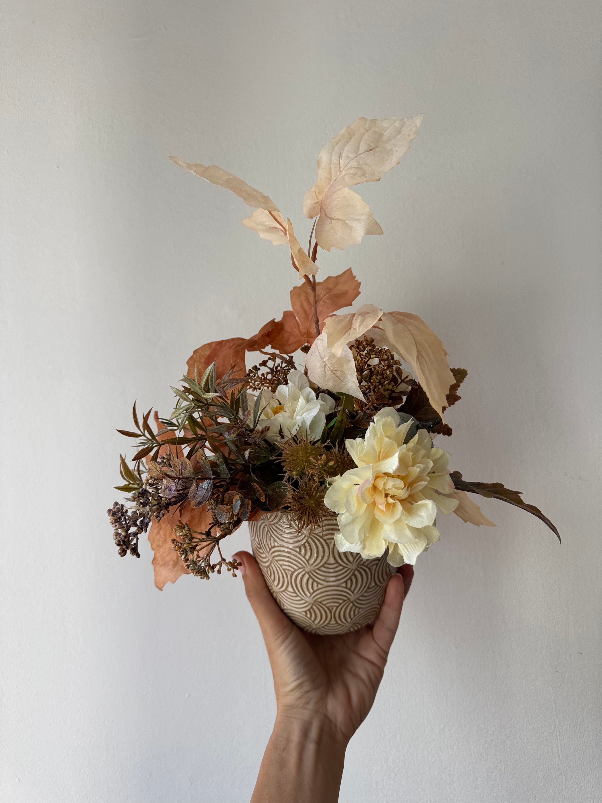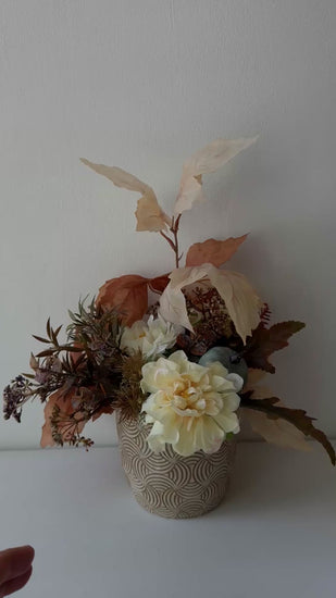 Élethű művirágok krém kerámiakaspóban.