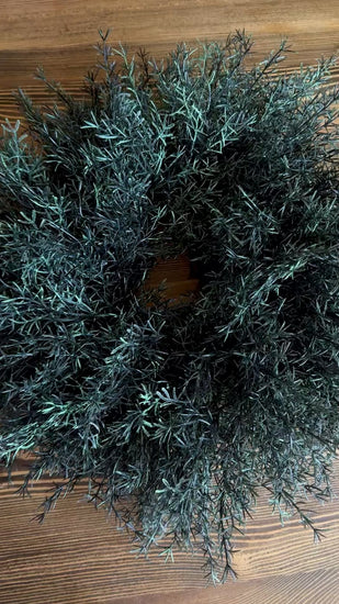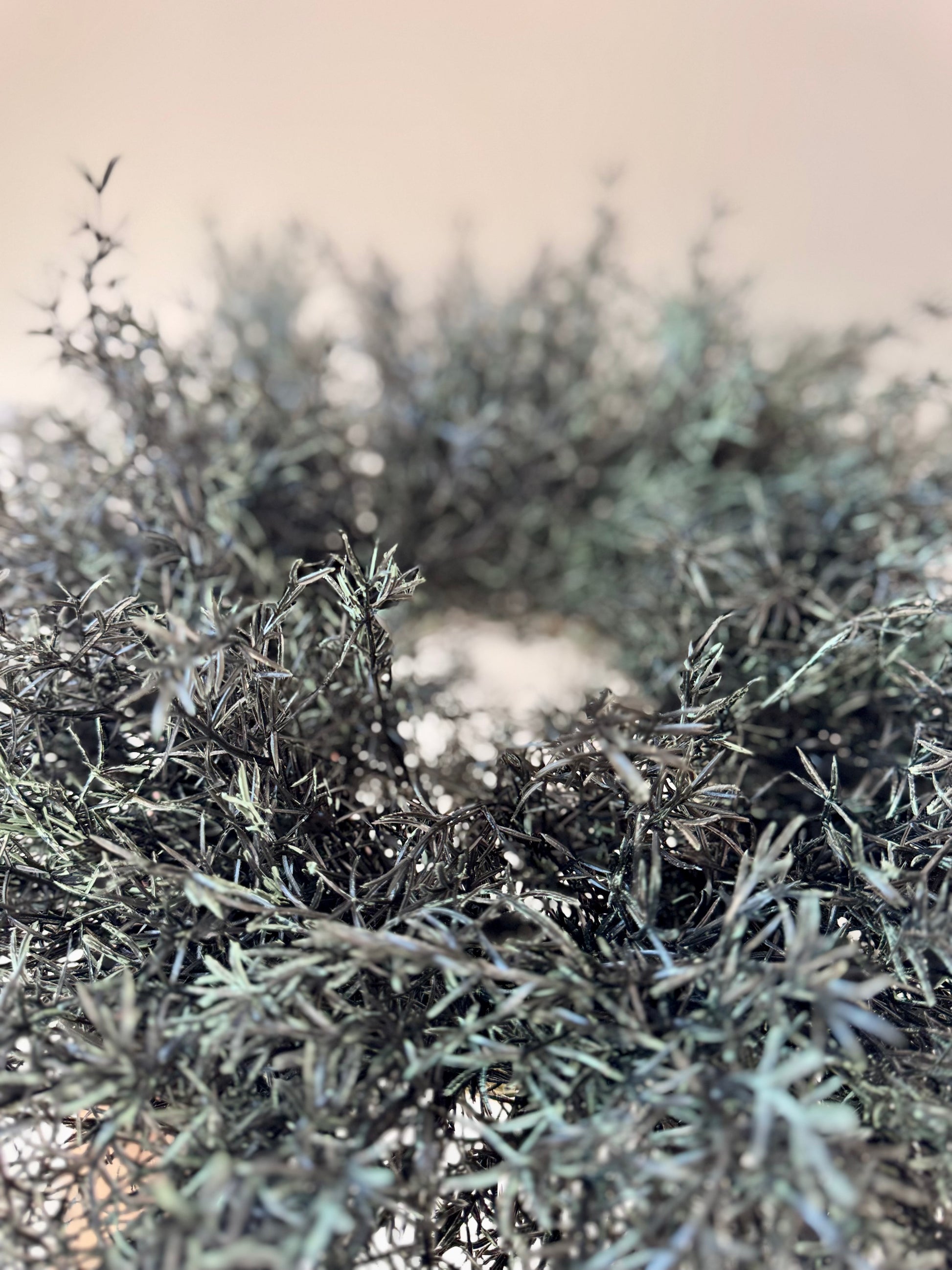 Sűrű, puha levelekből álló bozontos fekete ajtódekor, a levelek ugyanakkor türkizkékes hamvas festést kaptak. Nagyon jópofa. A képen ~35 cm-es koszorú látható. Magassága ha felfelé állítjuk a leveleket , akar 18cm is lehet. Maximálisan minimális!
